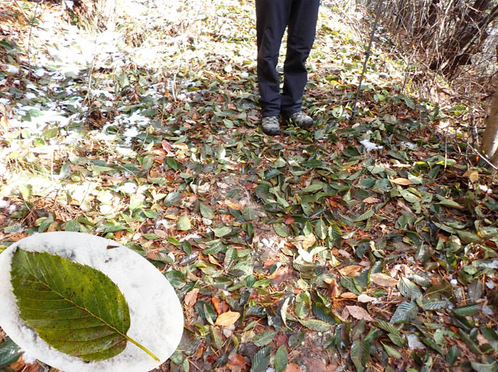 しばらく登ると、山道が緑色になってきた。葉脈のはっきりした緑の葉が一面に広がっている。先日登った時は赤やオレンジ色の葉が敷き詰められていたのに。葉柄がしっかりしていて葉の表面に艶があるこの葉はミヤマハンノキらしい。急に冷えて凍ったために樹上に残っていた葉が落ちたのだろうか。