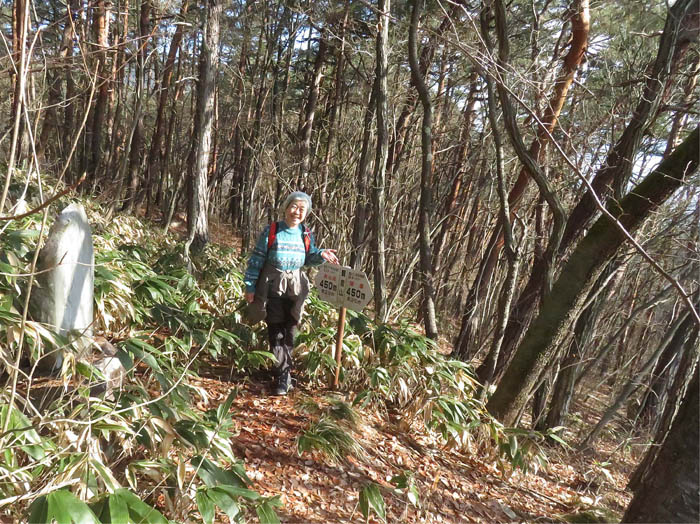 細い木が芽吹いて山道にまで張り出しているから気をつけながら行くが、落ち葉が一回雪で締められたのか、登山道は歩きやすいようだ。枯れ枝を分けながら登っていくと笹が出てくる。笹の中を僅かに進むと、西国三十三観音道との分岐に出る。ここからは善光寺平が見下ろせるが、向こうの山は白い霞に覆われている。根子岳など高い山の山頂部だけが日の光を跳ね返している。