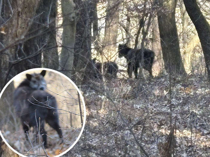 今日は青空の下にアルプスが真っ白に光っているから見て行こうかとも思ったが、それは帰りのお楽しみにして登り始める。ほとんど雪のない林道を歩き始めると、暗い森の中から何か飛び出してきた。カモシカだ。2頭のカモシカがザザッと枯れ草の音をさせながら斜面を走っていく。「待ってよ」と言いながらカメラを構えると、後ろの一頭が立ち止まって振り向いた。木々の重なる暗い森の向こうだったので、慌てて撮った写真はピンボケだったが、カモシカさんは、じろりと私たちを見て危険はなさそうだと思ったか、ゆっくり木々の間に消えていった。