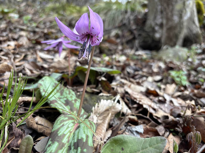 私たちはしゃがんで花を撮影したり、立ち上がって遠くまで続く花の広がりを眺めたりしながらのんびりと過ごす。カタクリの葉は手のひらくらいの大きな広いのが2枚、そしてその間から一本の茎が伸びて先端に俯き加減の花を一個咲かせる。周囲には葉だけの株もたくさんあるが、カタクリは芽吹いてから花をつけるまで7〜8年かかるそうだ。そして線のような葉がだんだん大きくなって、2枚になるとようやく花を咲かせる。