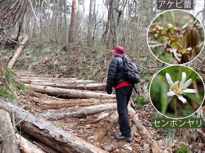 山道は踏まれて大きく窪んでいるところが多く、昨日の雨もあってかぬかるんでいるところも多い。しばらく登ると伐採した木を利用したのか、丸太をたくさん敷いた道が現れた。丸太には滑り止めの刻みが入れてあり、大変な作業だったのではないかと思う。ありがたく歩いていく。