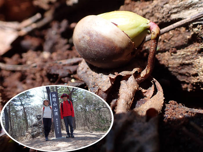 雨が多いけれど、晴れれば気温も上がってくるので、そろそろショウジョウバカマも咲き出すのではないか。長野に引っ越してきた時は森の中に続くピンクの点描に大喜びしたものだが、森が荒れるにつれてずいぶん減ってしまったように思う。ゆっくり六号古墳のあたりに行くと咲いている。落ち葉を持ち上げるようにして咲いている数輪のショウジョウバカマを見つけた。ショウジョウバカマを見つけたので、今日の目的は達成とばかりに倒木の多い森をうろうろ、粘菌はやはりまだみたいだ。少し前からぽっちりと膨らみ始めたミヤマガマズミの花芽がバンザイをするように小さな葉を伸ばして枝先に立っている。可愛いねと声をかけながら道を進む。山頂はすぐだ。こぼれたドングリがいつの間にか根を伸ばして地面にくっついている。その生命力にも感動だ。
