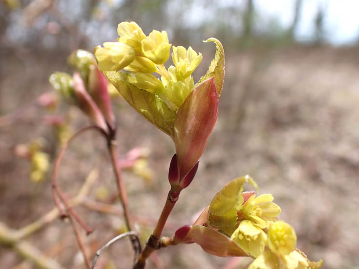 地附山にはいくつかの登山コースがあるから、それぞれのコースを歩いてみるが、3月の山はまだ眠りから覚めていない様子。見上げれば木々の梢に花穂が膨らんで次第に下垂してくるのだが、高い梢にあって枝に隠れているのでつい見過ごしてしまう。足元に落ちているのを見つけると梢を仰ぎ見てそれと知る。