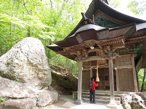山頂には人が溢れていた。飯縄山の写真を撮ろうと思っても人を分けて行くようだったから、当然山頂表示の前には撮影希望の人だかり。大きなグループの撮影が終わった隙にさっと一枚撮って、逃げ出した。降り始めたグループが進む方向を避けて、駒弓神社への道を降ろう。「逃げるが勝ち」、こんなに賑やかではクマさんもどこかへ逃げているだろう。