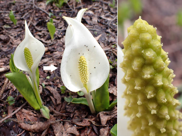 湿原は水芭蕉が咲き始めた。まだ葉が茂らない木立の向こうに戸隠山が透けて見え、出始めたばかりの純白の水芭蕉が広がっている。花と一口に呼んでいるが、白く目立つのは仏炎苞(ぶつえんほう)で、葉が変化したものだそう。その中に伸びた花茎があり、ここに小さな花が集合している。肉穂花序(にくすいかじょ)と言うのだそうだ。肉穂花序を近くで見ると黄色いぶつぶつがたくさんついていて、これが一つ一つの花。1本の雌しべと4本の雄しべがあり、先に雌花が成熟して、その後から雄花が成長してきて花粉を飛ばす仕組みらしい。雄しべは花粉がついているのでわかりやすいが、そこに雌しべが隠れているのか、近づいてみてもなかなかわからない。しかも、気がつくともう全体が雄しべになってしまっていることが多い。