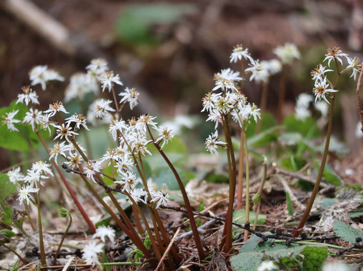 遊びながら歩いていたが、目的のセリバオウレン自生地を目指す。小さな春の花が咲き出しているのを楽しみながら歩く。セリバオウレンは数年前に実を見つけたが、花の季節に出会っていなかったから、今年こそはとやってきた。そして、綺麗に咲いていた、セリバオウレン。オウレンの仲間を見つけるといつも思うが、花火が弾けたような華やかさだ。