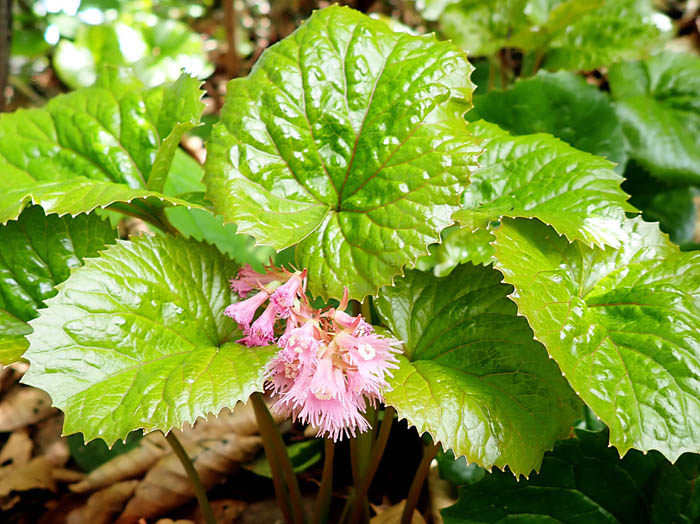 歩いていると所々にエンレイソウ、ツクバネソウの群落があり、フキの花も白い花穂を一面に伸ばしている。ホウチャクソウ、チゴユリがここにもたくさん咲いている。