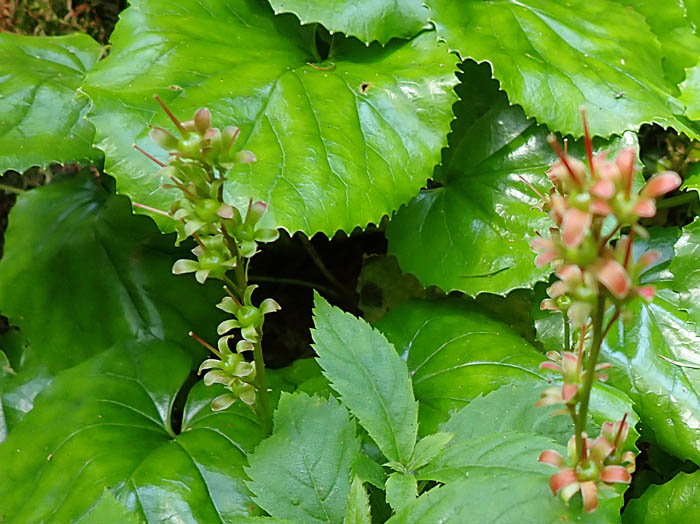 もう草丈が高くなった道を「ワニグチソウは隠れてしまっているかな」と言いながら降りていくと、タニギキョウがまだたくさん咲いている。近くには一面コチャルメルソウの葉が広がって、小さな実をつけ始めている。