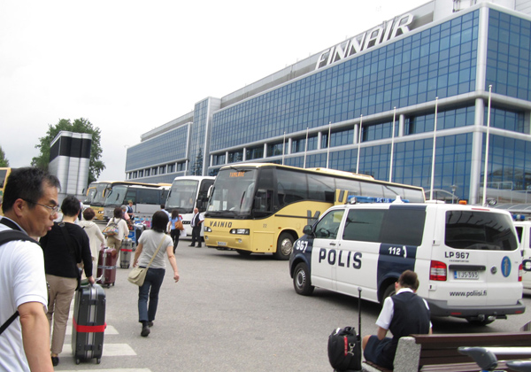 ツアーの仲間がそろい、私たちはバスに乗って、順調にヘルシンキの空港に着いた。ここへ来て雲が多くなって来た。そういえばフィンランドに着いたときも雲が厚く、雨っぽい天気だった。しかし次第に雲が遠のき、気持ち良く旅ができた。晴れ男、横浜のおじさんの威力に守られたのか、最後まで快晴。このまま空の旅も快適に行くように…とそっと願う。