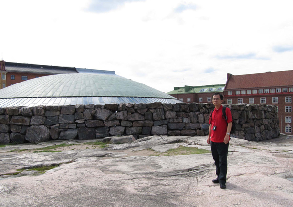 午後の見学はまずテンペリアウキオ教会。さっと食事をして今度は予定通りに走れて時間前にたどりつくことができた。この教会では結婚式が執り行われていて、一つの式が終わると次の式が始まるまでの間の15分間のみ入場することができるそうだ。その15分にかけて観光バスが沢山集まってきている。私たちは比較的早く着いたので、教会の入り口近くにバスを止めることができた。そこで入場の時間までに教会の屋根となっている岩山を登ってみることにした。教会の入り口の左側に回り込むと、そこはもう岩山。ゆっくり登ると、教会の円形の屋根が重い緑に光っている。この岩山は周囲を住宅で囲まれている。遠くまで続く道路に添って一定の高さに揃えられたアパートメントが続く。建物は落ち着いた色合いに揃えられ、とても美しい。