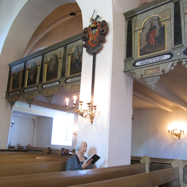 トゥルク大聖堂、そしてラウマ聖十字架教会と、あまり知らない教会ばかりだ。でもどちらも質素だけれど、エレガントなたたずまいの教会だ。説明を聞いてもなかなか覚えられないのでもらったパンフレットを見てみると、700年以上の歴史を持つ建物だそう。フィンランド福音ルーテル派の教会の中心となる礼拝堂で、フィンランド国民にとっての聖堂だと書いてある。石の建物で窓は小さく質素な造り。石の建物なので、外観は似ているが、天井のフレスコ画とステンドガラスの窓が、トゥルクの教会との違いを感じさせた。祭壇に向かって質素な木の長椅子が並べられているが、後の方の柱の近くに一人の婦人が聖書を持って座っている。一瞬本当に人がいるかと思ったのだが、この婦人はずーっと祈り続けている…木像だった。