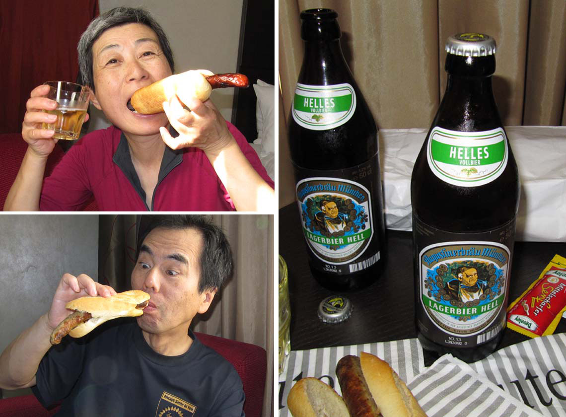 ホテルに戻って夕食。バンベルクでやっと探したラオホビールと、スーパーで買ったフルーツ、そして、長〜いソーセージを挟んだパン。もう一つは厚いハンバーグを挟んだパン。ドイツのパンは麦そのものの味が濃くて、挟んだものを引き立てている。とてもおいしい夕食だった(写真123、124)。