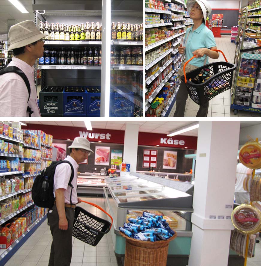 私たちは今日の夕食と、お供のワインを買おうと思っている。お酒売り場に行ってみたが…あるある、いくつもの棚にびっしりと並べられた酒の瓶。お酒のデザインはおしゃれなものが多いので、見ていると楽しくなるが、ここから一つを選ぶのは大変。しかも文字が読めない。しばらく見て回った後、売り場の女性に聞くことにした。ちょうど持っていた案内書に載っていたので、そこを指差して聞く。買いたいのはドイツのスパークリングワイン「ゼクト」、女性は小さな文字に顔をしかめながらも目を近づけ、にっこりした。「オー、ゼクト」と言いながら、目の前のレジ横に山と積み上げてあるスパークリングを指差す。灯台下暗しとはこのこと?私と夫は今日の分と、日本に持ち帰る分と2本のゼクトを買った。