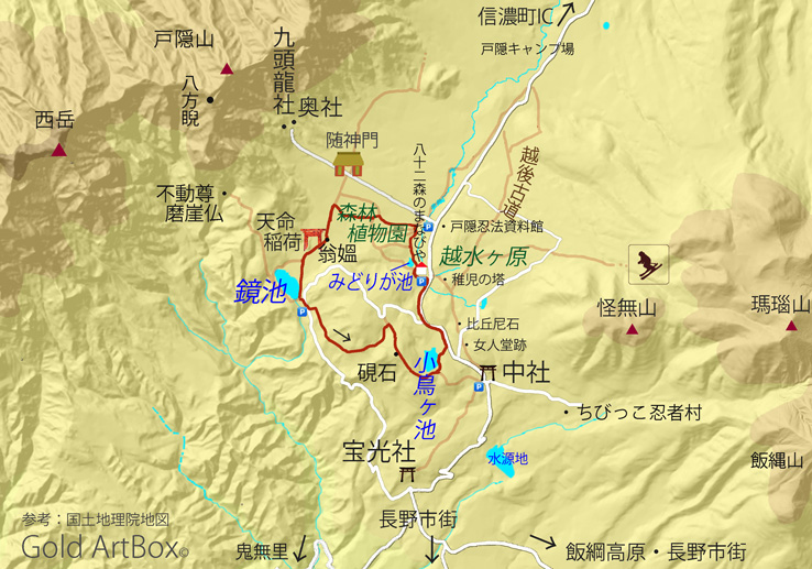 まず中社まで戻ってから池巡りをしようかと話していたが、雲が多くなってきたので、鏡池に先に行くことにした。名前の通り、池の面に戸隠山が映る池だ。青空ならさらに良いと、雲が広がらないうちに行こう。
